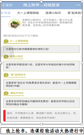 由于本次抢书活动学生反响良好,针对这次的活动,学院易班后续还会推出新的活动并加大宣传力度以及奖励手段,促进同学们的参与热情。与此同时,易班的学长们也分享了选课的经验,选课小步骤,选课课程和纺设班实验班等的介绍,新同学们受益良多,不会再因对选课方面的问题一无所知而感到迷茫,也让新生们对大学更多了一份向往与憧憬。