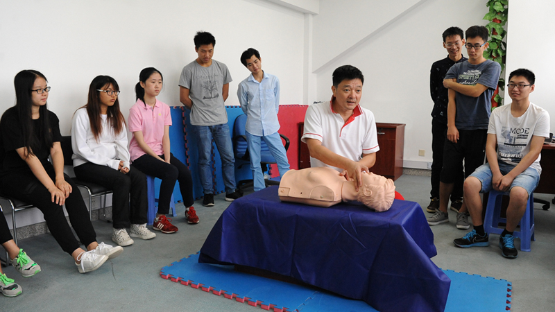 在采访夏老师之前,就常听同学们说,夏老师的课堂氛围很轻松,寓教于乐。记者有幸旁听了一堂心肺复苏课程,十几平米的心肺复苏实训室里挤满了前来听课的学生。课堂上,夏老师亲自演示各项急救动作,在讲到心肺复苏的按压动作时,他反复强调正确的按压深度及频率,并给同学们提供按压深度及频率的规范操作范围,而不仅是陈述一个个简单的数据。对于严谨枯燥的急救知识,夏老师结合正、反事例,深入浅出,帮助大家加深记忆,同学们在欢笑中轻松掌握了重要的知识点。