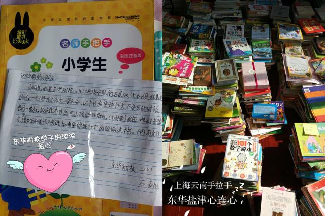 今年11月,恰逢东华附校第四届校园读书节期间,由附校发展处、政教处联合发出的“东华盐津手拉手,经纬悦读心连心”为云南盐津捐书筹建爱心阅览室的倡议很快得到了附校师生、家长的大力支持,有的孩子在书籍里还添置了铅笔、橡皮等文具,并在扉页上写下深深的祝福;有的家庭甚至买了一箱全新儿童读物捐赠出来,不少老师也参与到捐书活动中,令人感动。东华附校8个年级2538名学生在短短1周时间内,为盐津县黄草社区及黄草小学捐赠了3400余册图书,帮助当地建立了与东华附校图书馆同名的“经纬悦读园”,寓意“同一片蓝天,共享经纬阅读之乐”。11月中旬,37大箱打包齐整的捐赠书籍插上爱心的翅膀从上海飞往盐津,并于11月23日顺利抵达县城,11月25日捐赠书籍已达到黄草小学。
