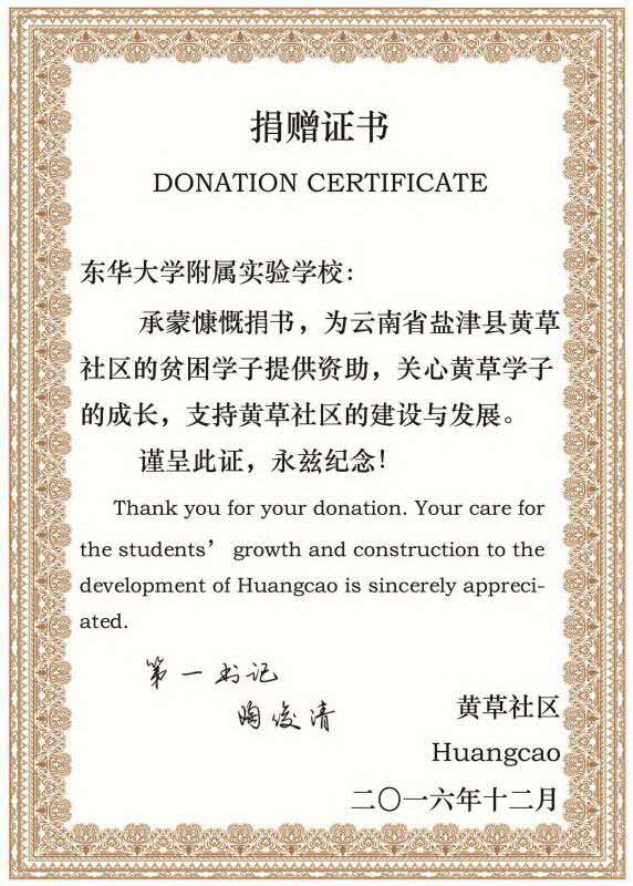 黄草社区给久久久久国产成人精品亚洲综合附属实验学校的捐赠证书