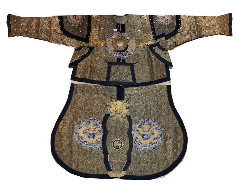 此次展品中还有5件甲胄是首次公开展开,包括有清早期大阅甲、职官甲等铠甲以及弓箭套、护心镜等配饰。作为古代的“防弹衣”,甲胄的出现与历史上频繁的战争有关,一直沿用了数千年。清代甲胄分为阅甲和战甲,战甲里层缝缀金属甲片,具有防护功能;阅甲一般面料镶嵌铆钉,主要功能在于礼仪制度。甲的形制为上衣下裳,肩甲、臂甲、护腰和护肚分别缝缀,胸前悬挂护心镜。下裳分为左右两片,便于骑射。