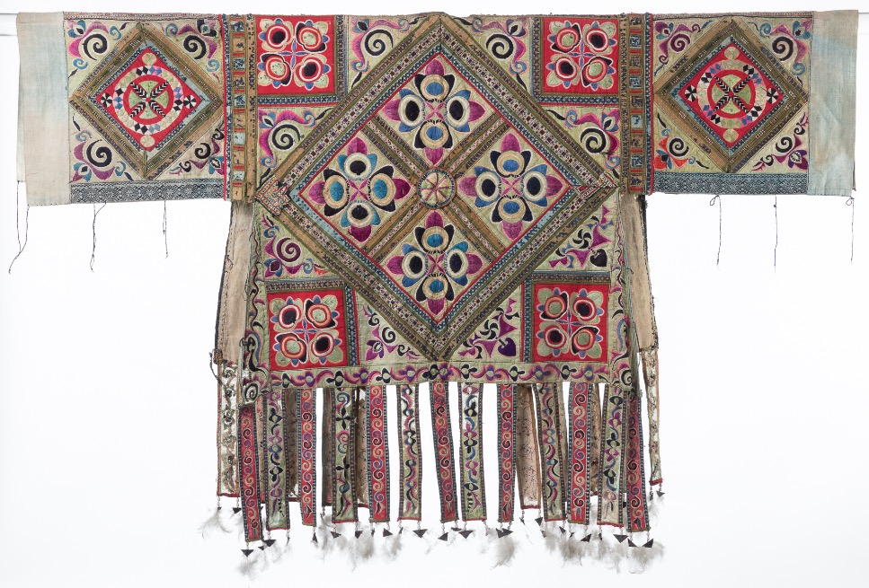 “这件牯臟衣是苗家在过牯臓节时,苗族牯臓首领在节日中穿着的盛装,是作为宗教仪式中的特殊形式而传承下来的古老苗族服装。”本次展览联合策展人李苏琴指着一件看似稍显陈旧的服饰告诉记者,苗族是一个没有文字的民族,但是服饰同样会“说话”,通过款式和纹饰等特殊“语言”,讲述着苗族古老而悠久的历史文化。这件牯臓服由上衣和飘带两部分组成,衣服形制独特,无领衣、衣身平直、开襟无扣、两侧及袖下不加缝合,袖身正面由蓝靛染亮布缝制,衣身绣满纹饰,有自然界的日月星辰纹、花鸟虫草纹,蕴含着万物有灵的观念和自古传承的特殊含义,体现出古朴神秘的气息。