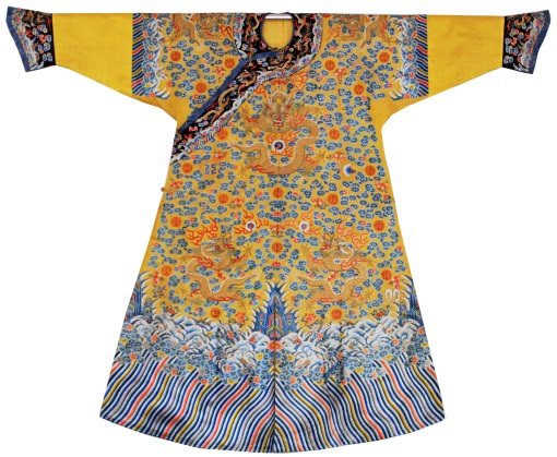 展品中一件明黄江绸五彩绣十二章龙袍尤为引人注目。龙袍是清代重要的礼仪服饰,它象征着穿着者的身份和地位。清代服饰制度对龙袍做了严格的界定,只有皇帝、皇太子及其后妃们可穿用龙袍,其他人等不得穿用。这件龙袍十二章纹,按照服饰制度应为皇帝所穿用,为清晚期织绣品,品相良好,款式为圆领大襟箭袖开衩袍,袍上正龙龙首正向,平视前方,龙身盘绕踞坐;行龙龙首侧向,辅以海水江崖、五彩祥云,一种威震天下的王者之气油然而生。