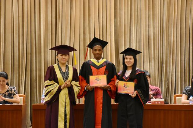 本次毕业典礼上,学校举行了马来西亚和乌干达2个国家的海外校友分会成立仪式,发展联络处处长、校友会秘书长瞿斌宣布校友分会成立,刘春红副校长为校友会联系人颁发了校友会会牌。留学生校友是学校宝贵的校友财富的组成部分,留学生校友遍布世界各地,海外校友分会的建立将发挥桥梁和纽带作用,成为海外中外校友交流的平台,并不断加强校友和母校的联系。