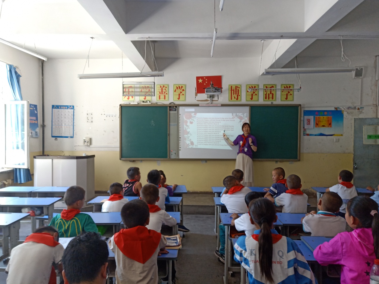 活动期间,实践团成员结合外语学院专业优势,在昌吉市新科园社区、阿什里哈萨克族乡中心学校开展了为期一周的“红领巾小课堂”志愿授课。课业辅导、素质拓展、亲情陪伴……实践团大学生们化身一个个“小老师”,认真备课,合理安排教学内容,精心准备教学课件,还自己采购糖果、贴纸作为奖励,孩子们热情高涨,踊跃参与,认真聆听小老师带来的一堂堂生动有趣的课。实践团累计上课30余次,辐射带动受益学生1500余人。在实践团成员离开前,阿什里中心学校四年级维族学生阿依莎娜·许库尔提向小老师们赠送了她亲手画的蜡笔画,表达满满的不舍与感激之情。